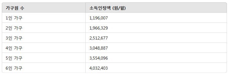 ✔교육급여는 기준 중위소득 50% 이하 가구의 초·중·고등학생을 대상으로 합니다. 2025년 기준 중위소득 50%에 해당하는 가구원 수별 소득인정액은 아래와 같습니다.